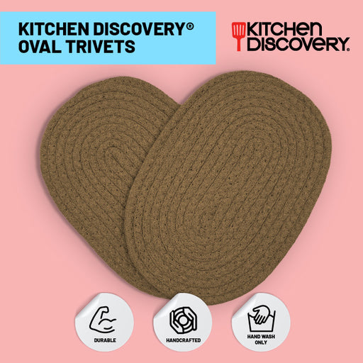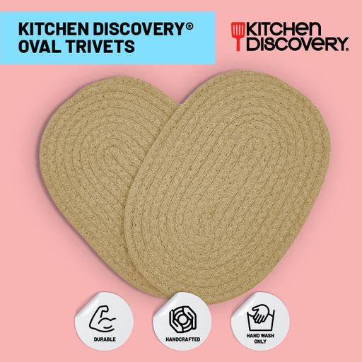 Kitchen Discovery™VERSATILE 100% COTTON: Our set of 2 Oval Trivets (8" X 11.5" each) are practical for use under baking dishes, stockpots, casseroles, skillets, and...