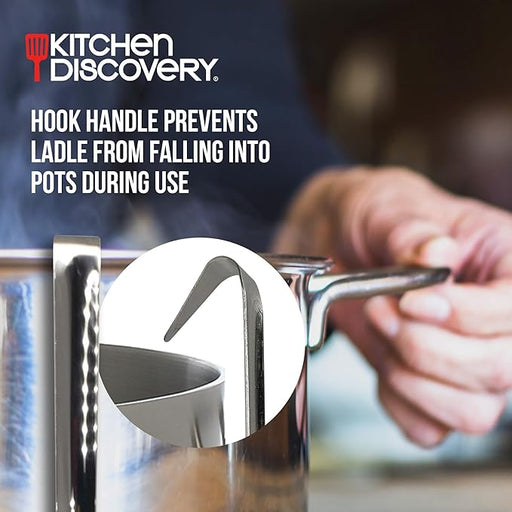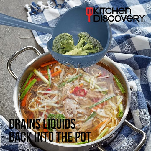 View full detailsStainless Steel Straining Ladle – Kitchen Discovery – 2 in 1 Strainer Ladle for Soups and Stews Drains Liquids from Solids. Serving Ladle with Built In Strainer is Safe in Boiling Water and Hot Oil #24712